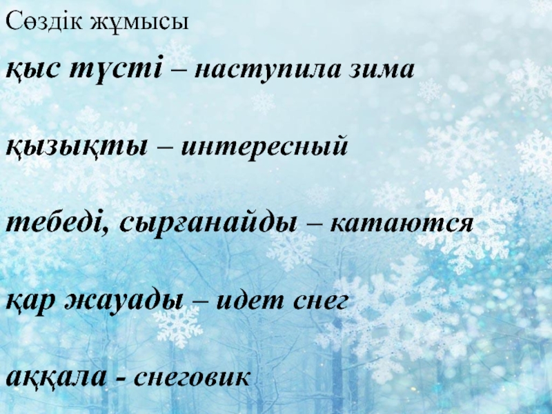 қыс түсті – наступила зимақызықты – интересныйтебеді, сырғанайды – катаютсяқар жауады – идет снегаққала - снеговикСөздік жұмысы