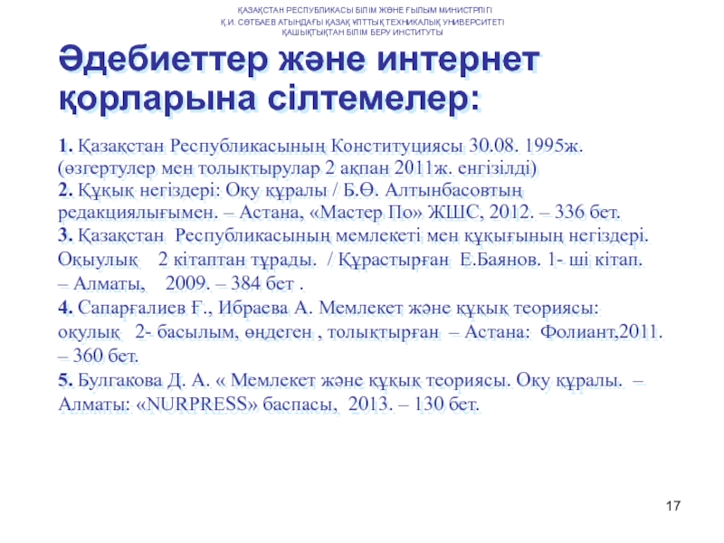 3. Қазақстан Республикасының мемлекеті мен құқығының негіздері. Оқыулық 2 кітаптан тұрады. / Құрастырған Е.Баянов. 1- ші кітап. – Алматы, 2009. – 384 бет .