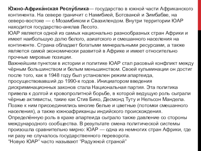 Слайд 3Ю́жно-Африка́нская Респу́блика— государство в южной части Африканского континента. На севере