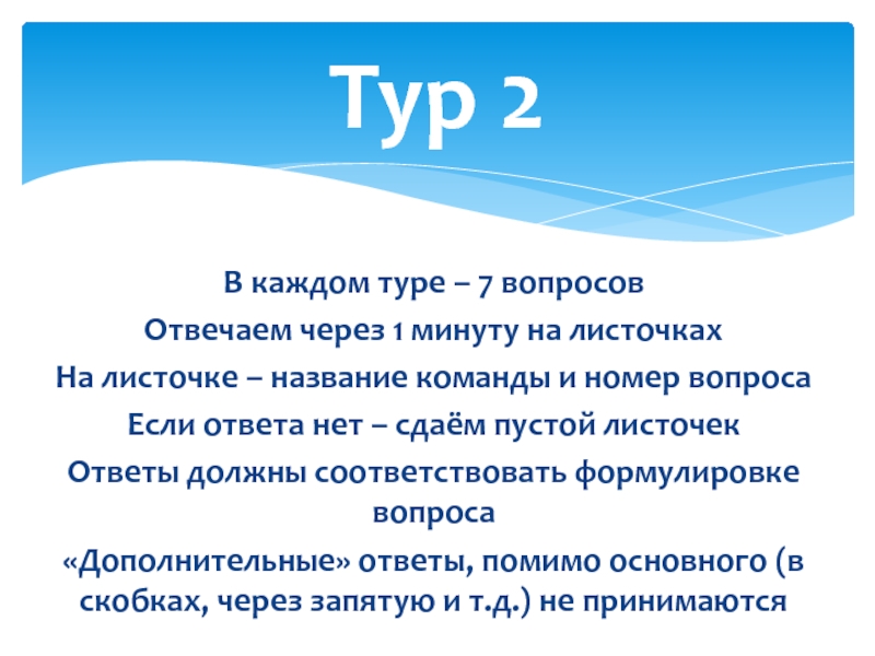 Тур 2В каждом туре – 7 вопросовОтвечаем через 1 минуту на листочкахНа листочке – название команды и