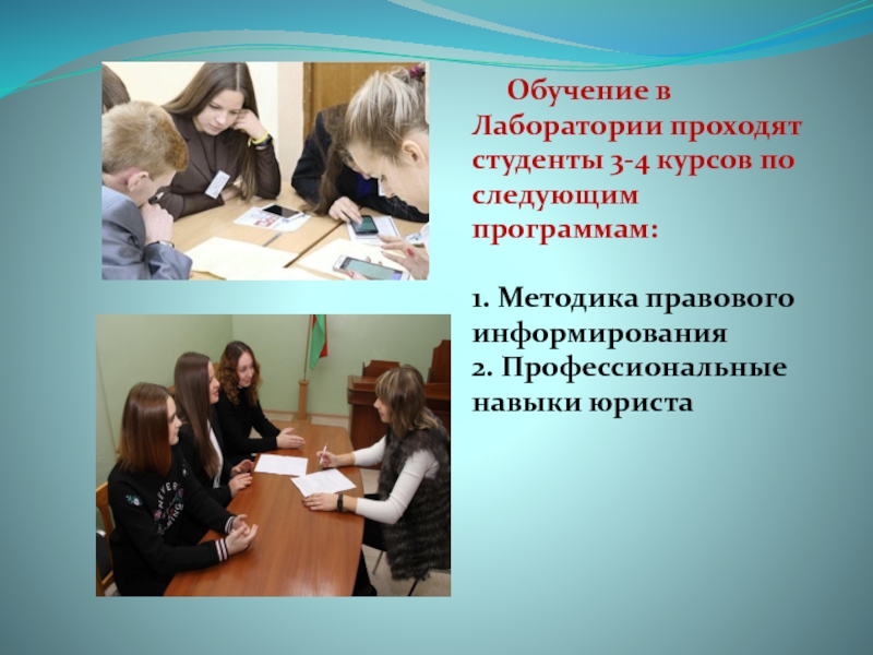 Обучение в Лаборатории проходят студенты 3-4 курсов по следующим программам:  1. Методика правового