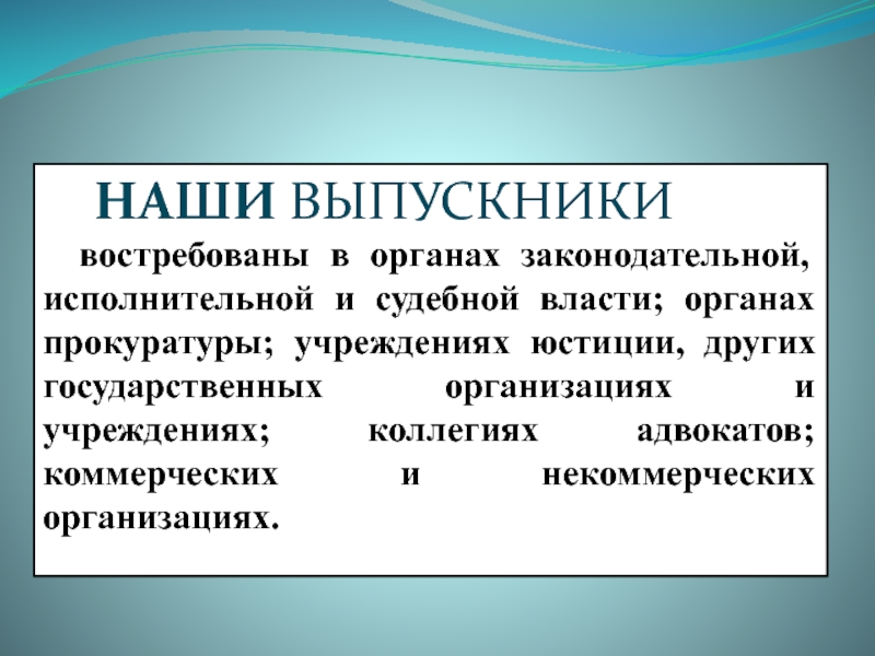 НАШИ ВЫПУСКНИКИ  востребованы в органах законодательной, исполнительной и судебной власти; органах прокуратуры; учреждениях юстиции,