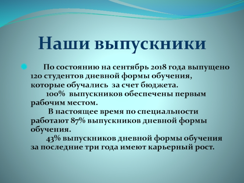 Наши выпускники   По состоянию на сентябрь 2018 года выпущено 120 студентов дневной формы обучения, которые