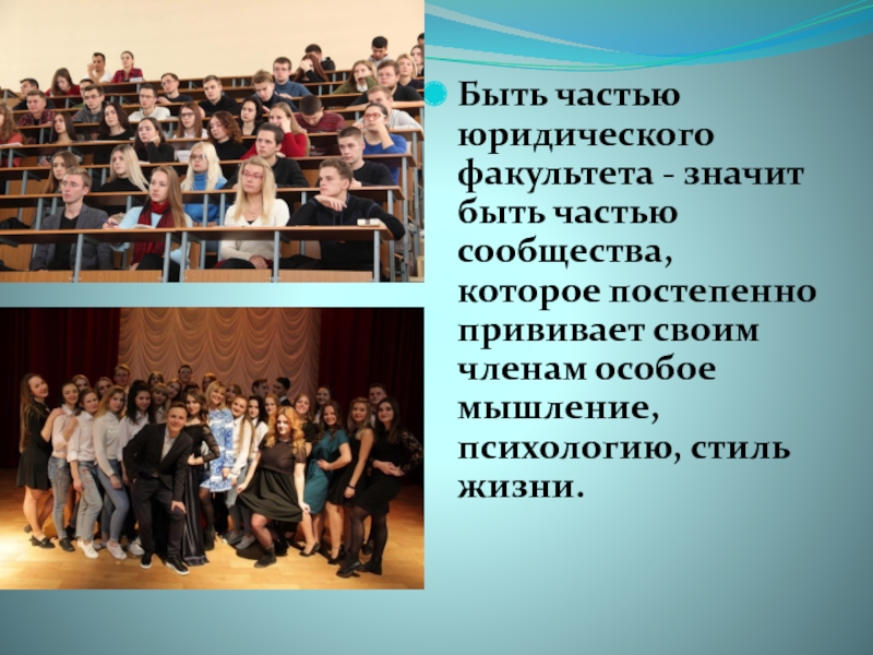 Слайд 11Быть частью юридического факультета - значит быть частью сообщества, которое