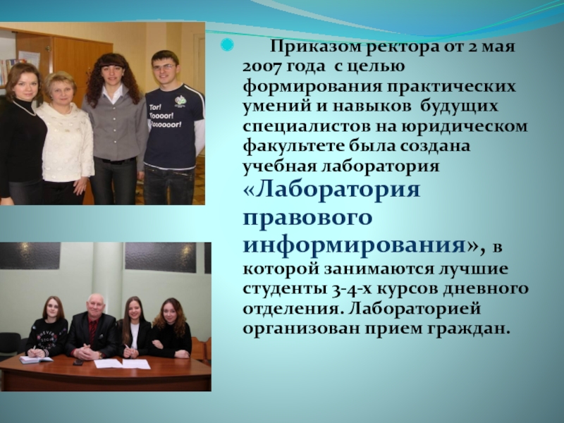 юридическом факультете была создана учебная лаборатория «Лаборатория правового информирования», в которой занимаются лучшие студенты 3-4-х курсов дневного отделения. Лабораторией организован прием граждан.