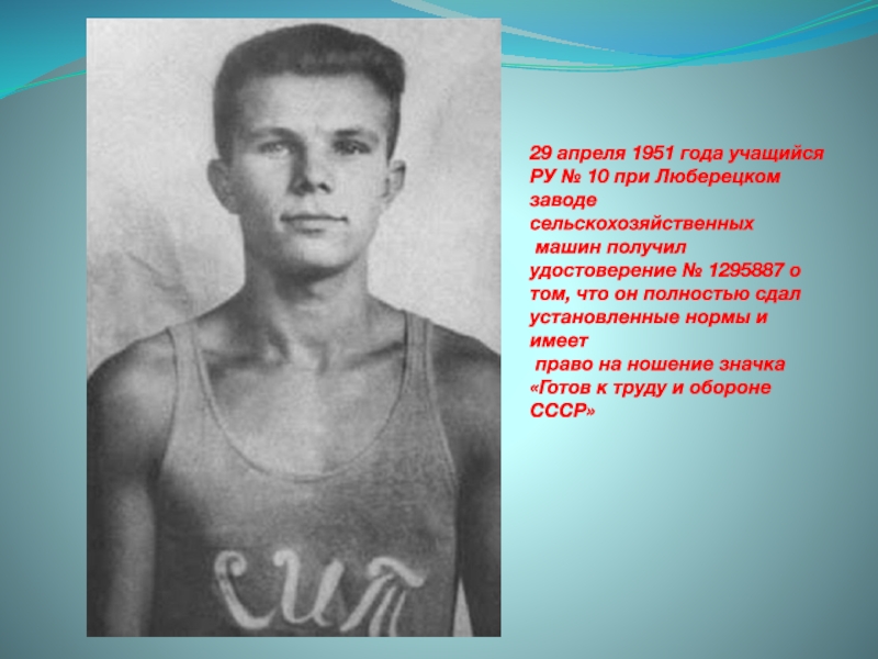 Слайд 729 апреля 1951 года учащийся РУ № 10 при Люберецком