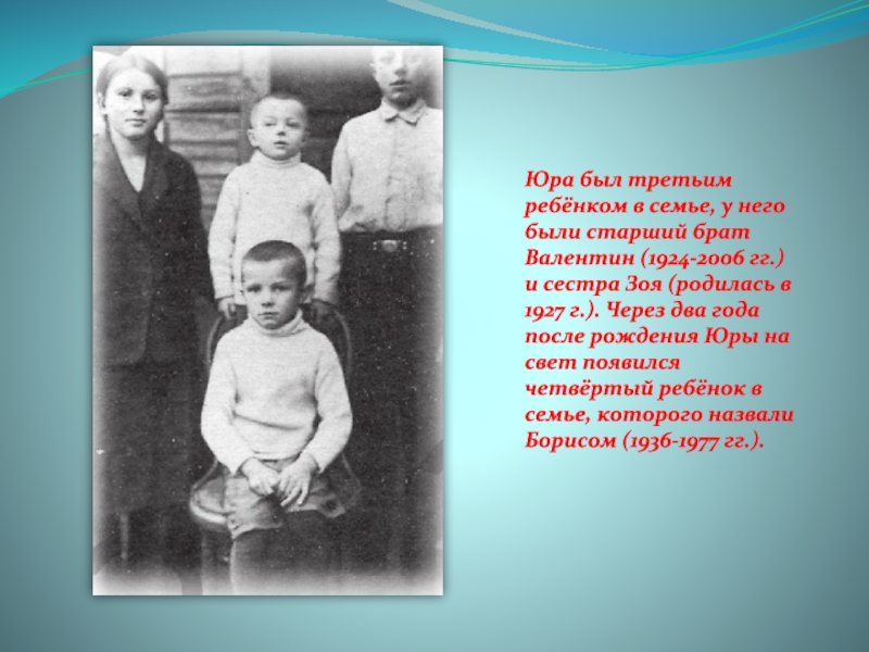 г.). Через два года после рождения Юры на свет появился четвёртый ребёнок в семье, которого назвали Борисом (1936-1977 гг.).