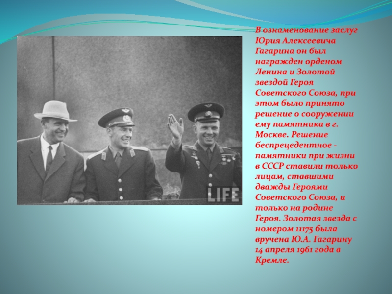 принято решение о сооружении ему памятника в г. Москве. Решение беспрецедентное - памятники при жизни в СССР ставили только лицам, ставшими дважды Героями Советского Союза, и только на родине Героя. Золотая звезда с номером 11175 была вручена Ю.А. Гагарину 14 апреля 1961 года в Кремле.