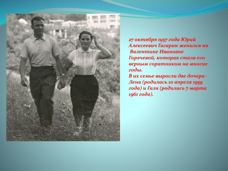 27 октября 1957 года Юрий Алексеевич Гагарин женился на