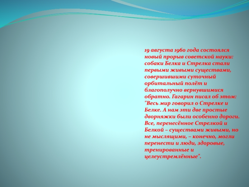 Слайд 1819 августа 1960 года состоялся новый прорыв советской науки: собаки