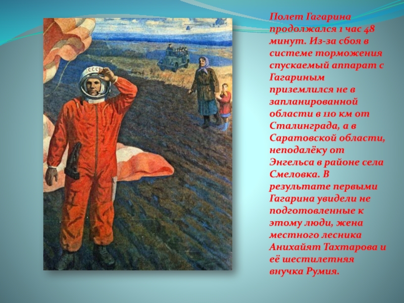 области в 110 км от Сталинграда, а в Саратовской области, неподалёку от Энгельса в районе села Смеловка. В результате первыми Гагарина увидели не подготовленные к этому люди, жена местного лесника Анихайят Тахтарова и её шестилетняя внучка Румия.