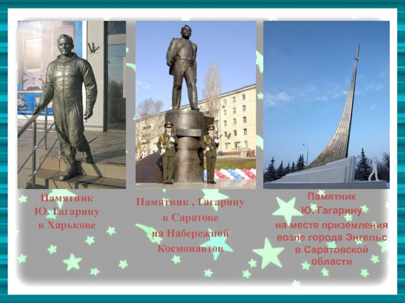 Памятник  Ю. Гагарину  в ХарьковеПамятник , Гагаринув Саратовена Набережной КосмонавтовПамятник Ю. Гагарину на месте приземления
