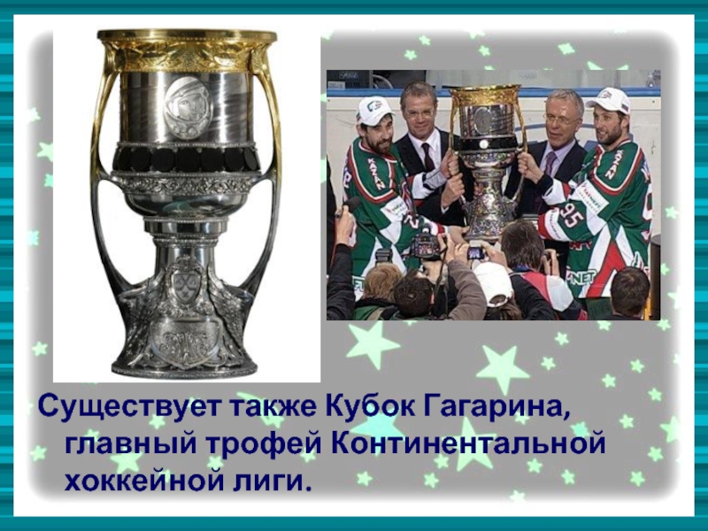 Слайд 18Существует также Кубок Гагарина, главный трофей Континентальной хоккейной лиги.