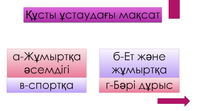Құсты ұстаудағы мақсата-Жұмыртқа әсемдігіб-Ет және жұмыртқав-спортқаг-Бәрі дұрыс