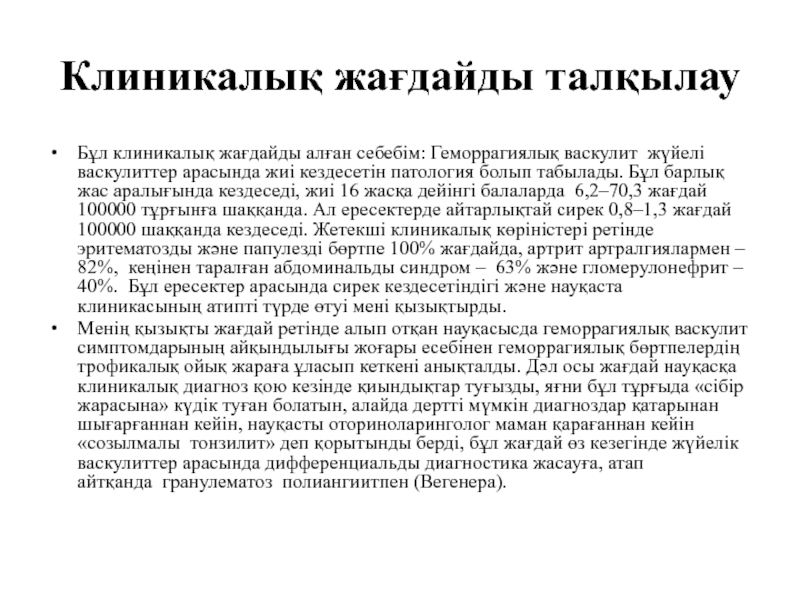Менің қызықты жағдай ретінде алып отқан науқасысда геморрагиялық васкулит симптомдарының айқындылығы жоғары есебінен геморрагиялық бөртпелердің трофикалық ойық жараға ұласып кеткені анықталды. Дәл осы жағдай науқасқа клиникалық диагноз қою кезінде қиындықтар туғызды, яғни бұл тұрғыда «сібір жарасына» күдік туған болатын, алайда дертті мүмкін диагноздар қатарынан шығарғаннан кейін, науқасты оториноларинголог маман қарағаннан кейін «созылмалы тонзилит» деп қорытынды берді, бұл жағдай өз кезегінде жүйелік васкулиттер арасында дифференциальды диагностика жасауға, атап айтқанда гранулематоз полиангиитпен (Вегенера).