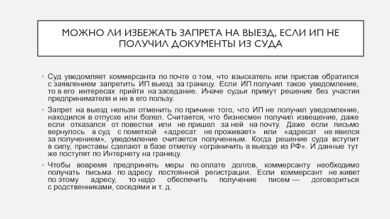 Слайд 7Можно ли избежать запрета на выезд, если ИП не получил документы из суда