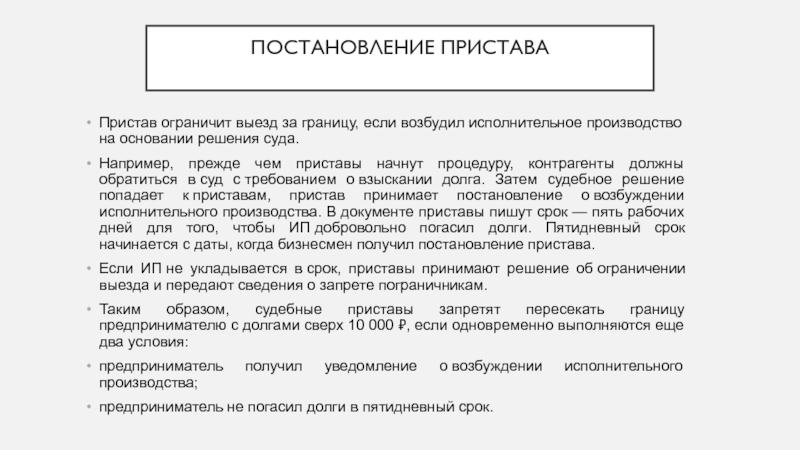 Таким образом, судебные приставы запретят пересекать границу предпринимателю с долгами сверх 10 000 ₽, если одновременно выполняются еще два условия: