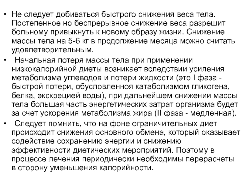 Слайд 50Не следует добиваться быстрого снижения веса тела. Постепенное но беспрерывное