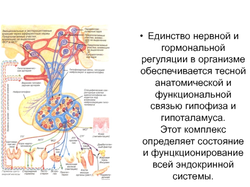 Слайд 2Единство нервной и гормональной регуляции в организме обеспечивается тесной анатомической