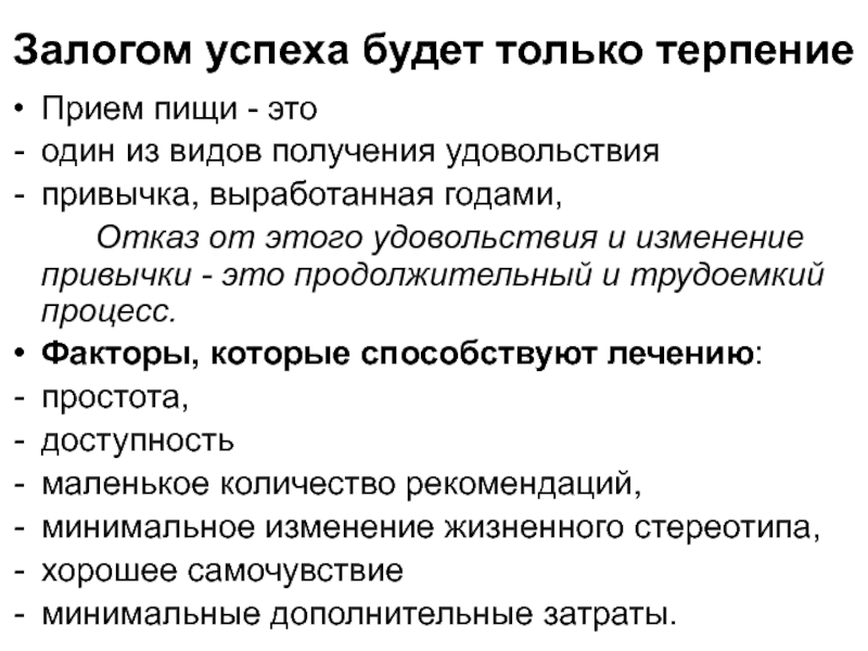 Изменения в рационе должны быть простыми и отвечать образу жизни больного. Применения более экстенсивных, радикальных и трудоемких методов едва ли будет длиться долго и вес восстановится.