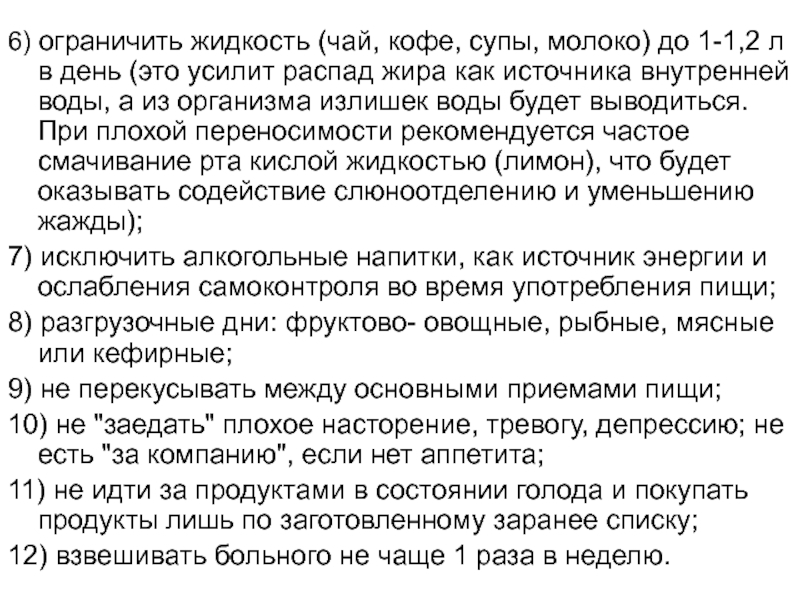 Слайд 496) ограничить жидкость (чай, кофе, супы, молоко) до 1-1,2 л