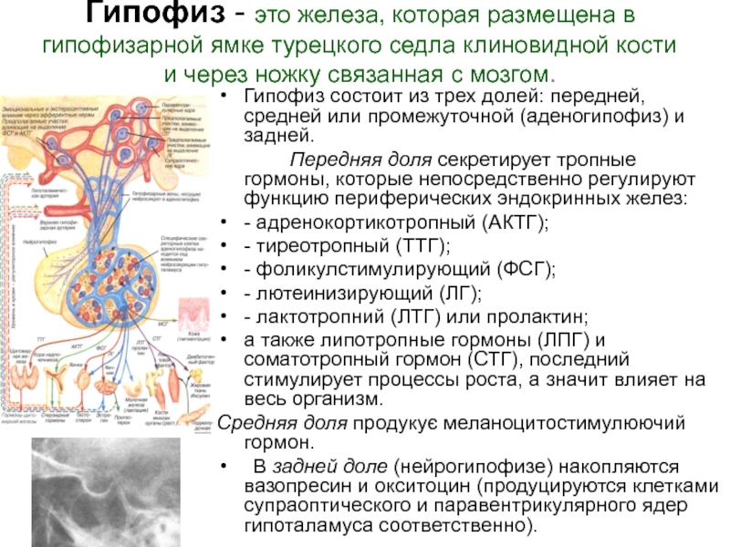 Слайд 4Гипофиз - это железа, которая размещена в гипофизарной ямке турецкого