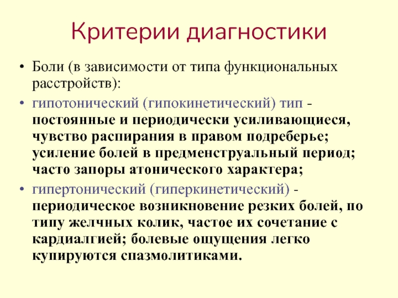 гипертонический (гиперкинетический) - периодическое возникновение резких болей, по типу желчных колик, частое их сочетание с кардиалгией; болевые ощущения легко купируются спазмолитиками.