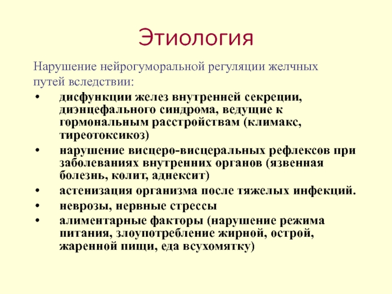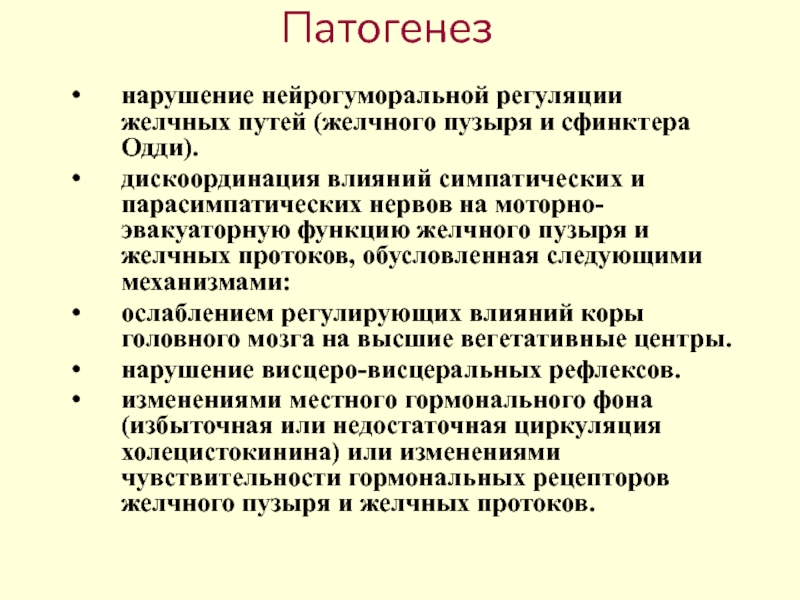 нарушение нейрогуморальной регуляции желчных путей (желчного пузыря и сфинктера Одди).