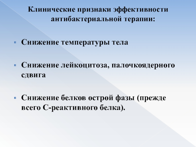 Слайд 51Клинические признаки эффективности антибактериальной терапии: