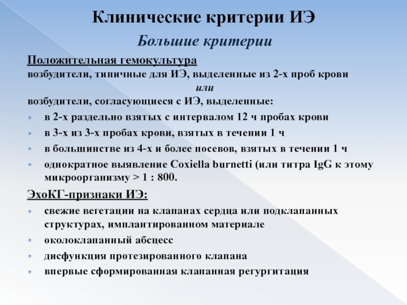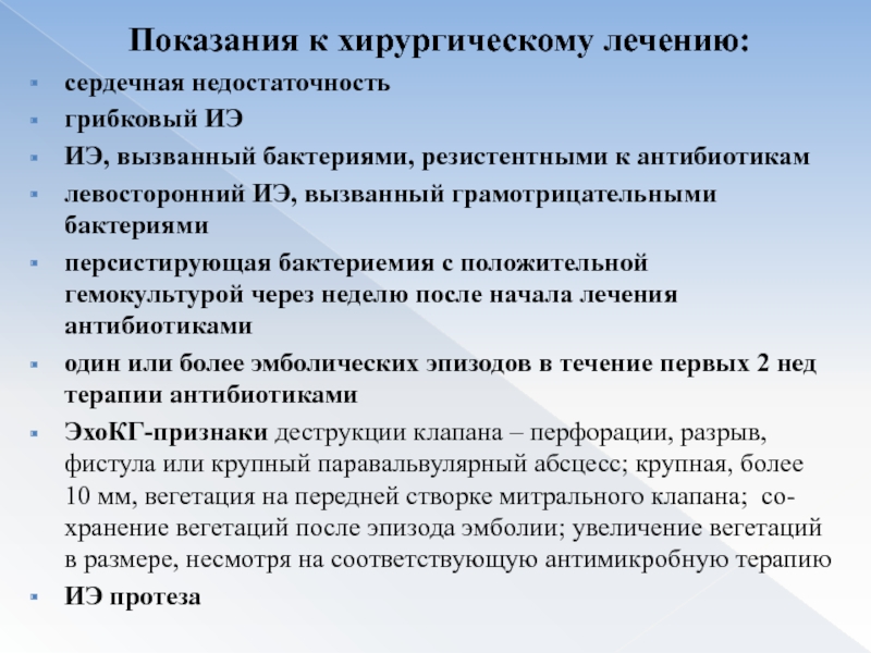 ЭхоКГ-признаки деструкции клапана – перфорации, разрыв, фистула или крупный паравальвулярный абсцесс; крупная, более 10 мм, вегетация на передней створке митрального клапана; со-хранение вегетаций после эпизода эмболии; увеличение вегетаций в размере, несмотря на соответствующую антимикробную терапию