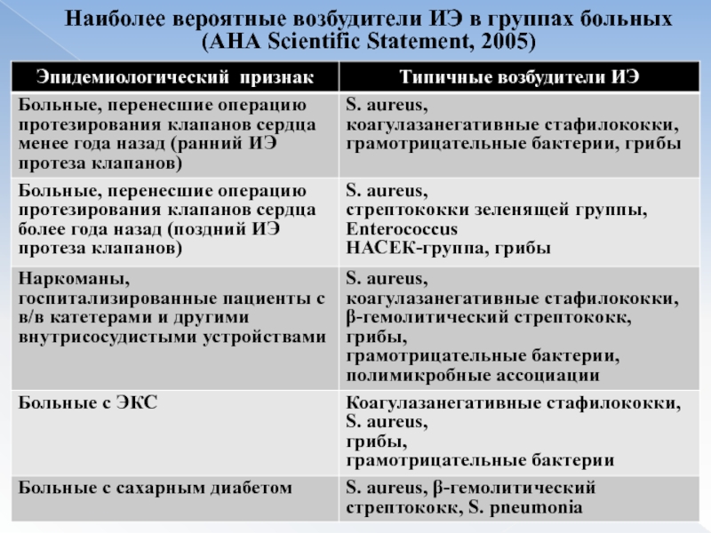 Слайд 14Наиболее вероятные возбудители ИЭ в группах больных