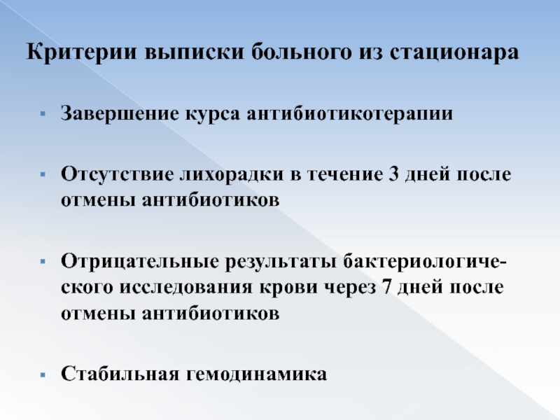 Слайд 55Критерии выписки больного из стационара