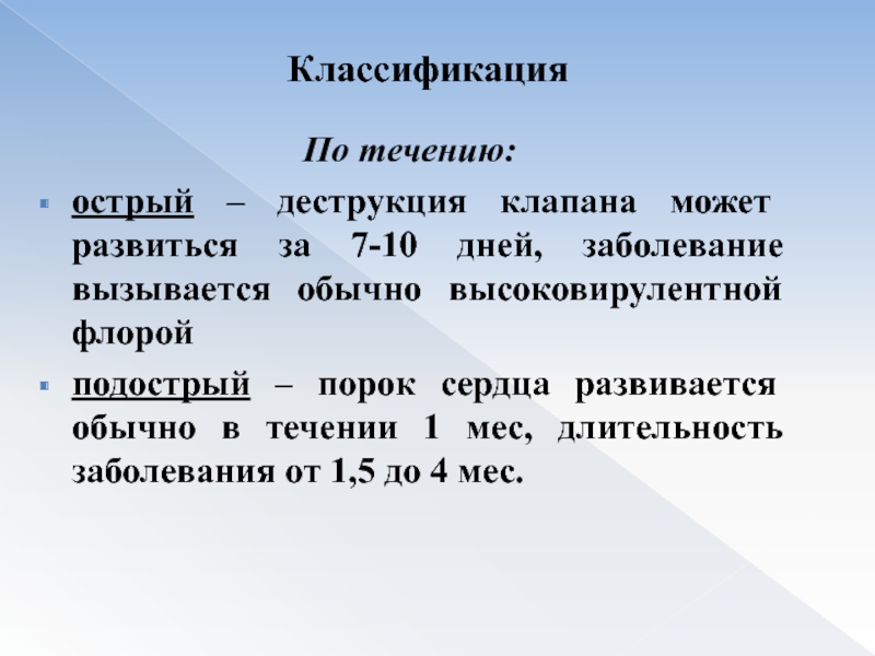острый – деструкция клапана может развиться за 7-10 дней,