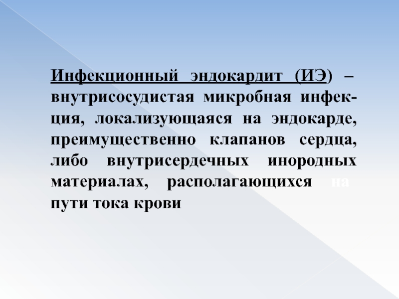 Слайд 12Инфекционный эндокардит (ИЭ) – внутрисосудистая микробная инфек-ция, локализующаяся на эндокарде,