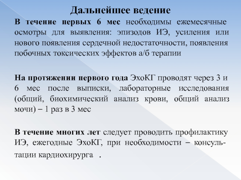В течение многих лет следует проводить профилактику ИЭ, ежегодные ЭхоКГ, при необходимости – консуль-тации кардиохирурга .