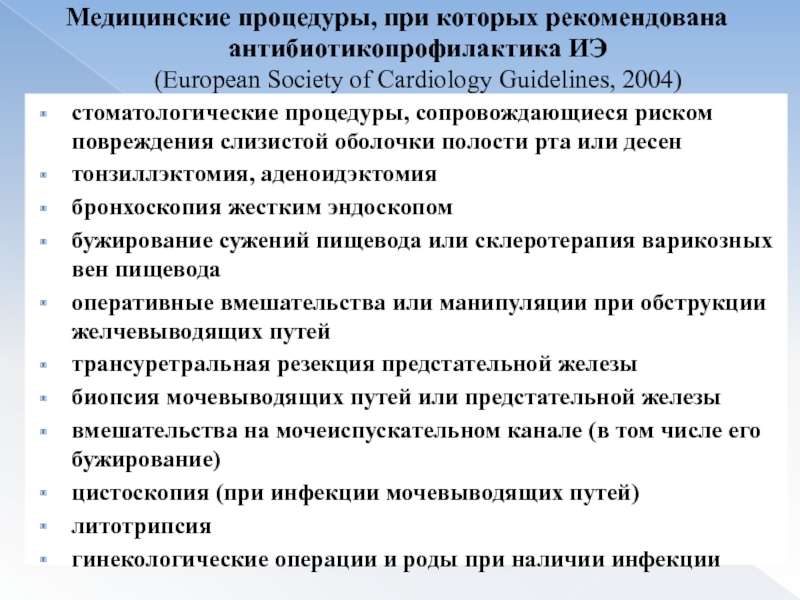Слайд 59Медицинские процедуры, при которых рекомендована антибиотикопрофилактика ИЭ