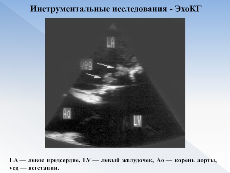Слайд 15LA — левое предсердие, LV — левый желудочек, Ao — корень аорты, veg —