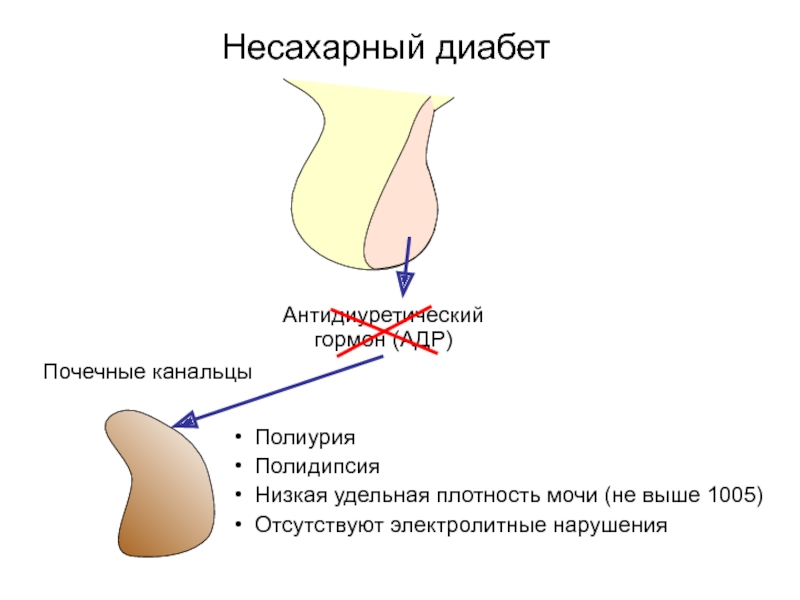 Несахарный диабетАнтидиуретическийгормон (АДР)Почечные канальцыПолиурияПолидипсияНизкая удельная плотность мочи (не выше 1005)Отсутствуют электролитные нарушения