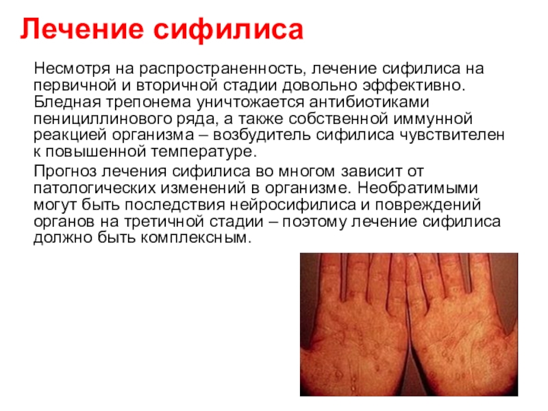 Вторичный сифилис развивается, когда бледная трепонема распространяется с кровью по организму – это может произойти через несколько месяцев, а то и лет после первичных симптомов. Сифилис на вторичной стадии при неэффективном лечении часто рецидивирует.