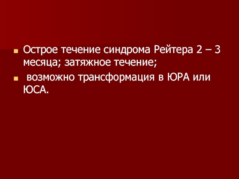 Слайд 15Острое течение синдрома Рейтера 2 – 3 месяца; затяжное течение;