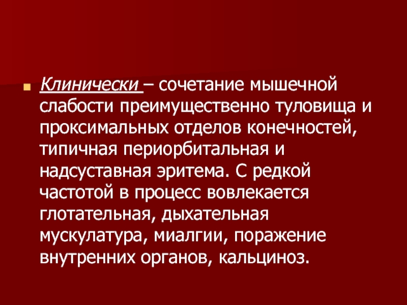 Слайд 42Клинически – сочетание мышечной слабости преимущественно туловища и проксимальных отделов