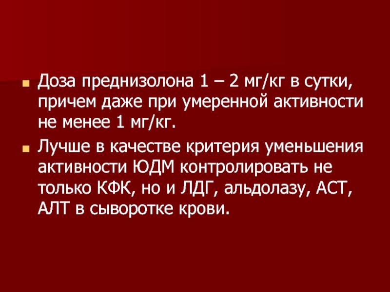 Слайд 47Доза преднизолона 1 – 2 мг/кг в сутки, причем даже