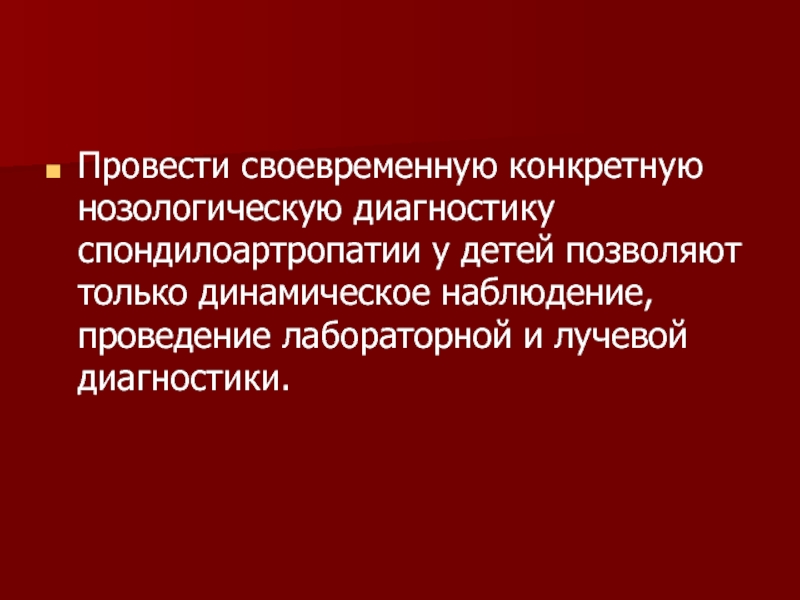 Слайд 18Провести своевременную конкретную нозологическую диагностику спондилоартропатии у детей позволяют только
