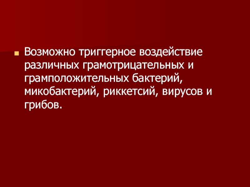 Слайд 5Возможно триггерное воздействие различных грамотрицательных и грамположительных бактерий, микобактерий, риккетсий,