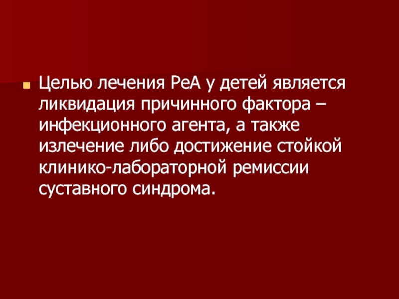 Слайд 24Целью лечения РеА у детей является ликвидация причинного фактора –