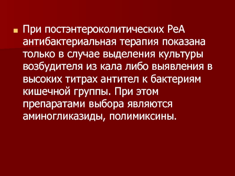 Слайд 30При постэнтероколитических РеА антибактериальная терапия показана только в случае выделения