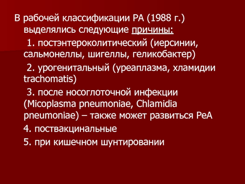 Слайд 4В рабочей классификации РА (1988 г.) выделялись следующие причины: