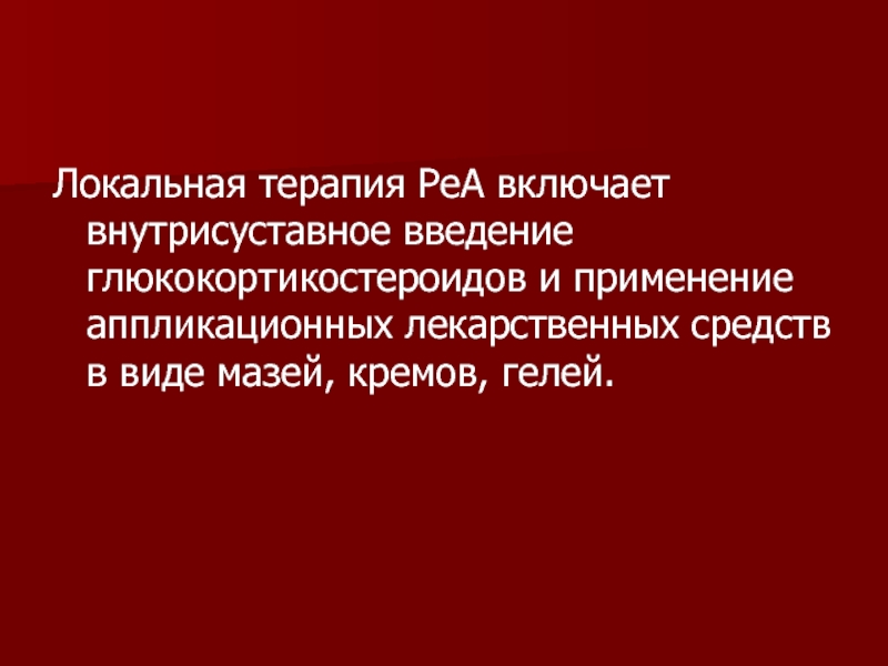 Слайд 35Локальная терапия РеА включает внутрисуставное введение глюкокортикостероидов и применение аппликационных