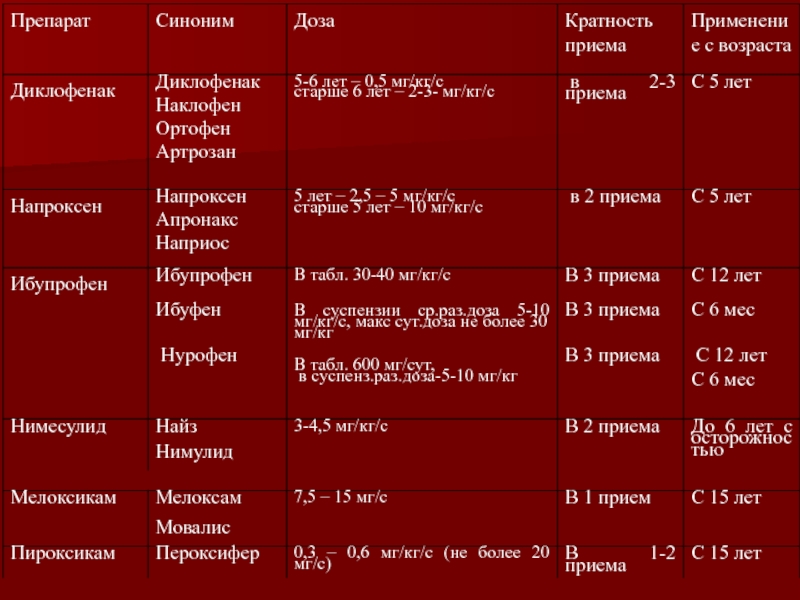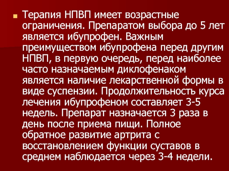 Слайд 34Терапия НПВП имеет возрастные ограничения. Препаратом выбора до 5 лет