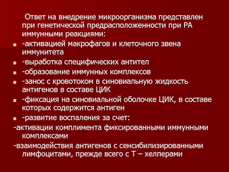 Слайд 6 Ответ на внедрение микроорганизма представлен при генетической предрасположенности при РА